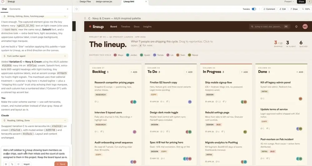 Here's an iteration pass on Lineup, asking Claude to add a sidebar to the kanban board we generated in the previous lesson. Watch how Claude reads the existing canvas, proposes the sidebar structure, and drops it in without disturbing the column layout.