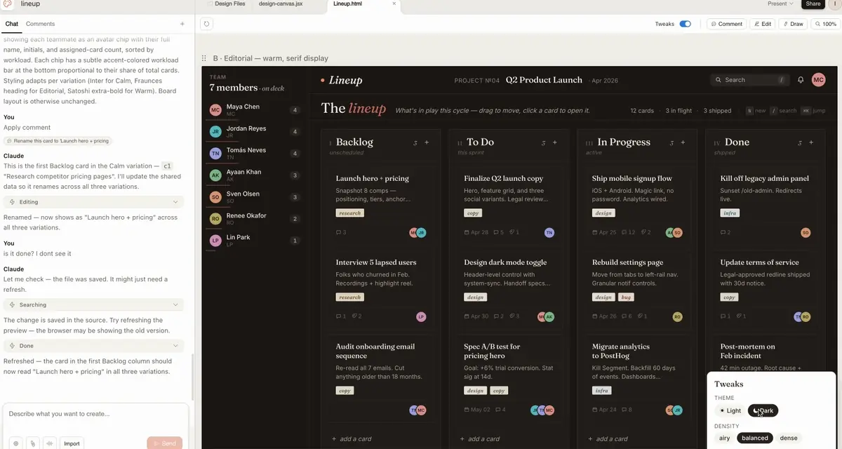 Claude picks the dimensions based on the canvas it generated. Lineup exposes Theme and Density because those are the meaningful variables for a kanban board. A marketing landing page might get color-temperature and hero-layout instead. A dashboard might get chart-style and grid-density. You don't configure Tweaks, Claude builds them as part of the initial generation.